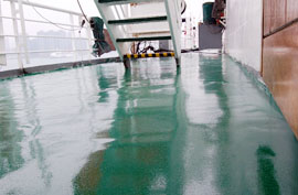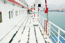 接到該訂單后,公司派一支素質(zhì)過硬的施工隊(duì)伍奔赴香港開始作業(yè),由于期間香港天氣變化反復(fù),時(shí)常下雨;待基面底漆頑固,銹跡斑斑難以清理,均為凹凸不平的麻面;再加上該郵輪白天需正常營(yíng)業(yè),施工多只能在晚上進(jìn)行,等等一系列因素都給施工帶來了嚴(yán)峻考驗(yàn)。青龍公司歷來重視每一筆訂,注重每一個(gè)細(xì)節(jié),董事長(zhǎng)宋敦清先生得知后,親自前往,與公司總工徐新生論證了一個(gè)最佳方案后開始指導(dǎo)施工,考慮到施工部位特殊,長(zhǎng)期在海面上風(fēng)吹日曬,最后選用了其耐候、耐酸堿、耐紫外線、耐老化、耐霉菌、耐鹽霧、耐臭氧、耐溶劑、耐磨、耐沖擊和耐油性等綜合性能優(yōu)異的CQ101防水密封涂料。先用特殊纖維填充10mm高度,再在上面找平3mm厚,然后用青龍CQ101防水密封涂料自流平成膜。經(jīng)過一個(gè)星期的艱苦奮戰(zhàn),順利完成施工。