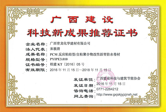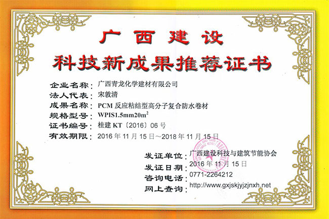 青龍PCM防水卷材已經(jīng)成功應用在全國500個大小防水工程上,防水效果顯著。此次獲得廣西科技新成果推薦證書,表明了我司防水卷材在質(zhì)量性能和各項指標方面均符合國家規(guī)定的質(zhì)量標準,質(zhì)量值得信賴。今后,我司也將不斷提高產(chǎn)品質(zhì)量,加大提升防水卷材科技含量和開拓深化防水市場的步伐,在防水市場上大力推廣青龍的品牌。