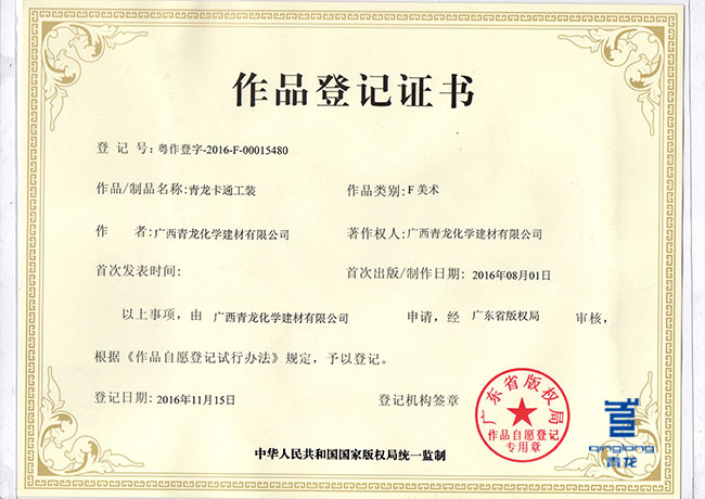 該證書(shū)的獲得,是青龍公司在知識(shí)版權(quán)工作上的又一個(gè)里程碑,它意味著青龍公司在具有獨(dú)立知識(shí)版權(quán)的防水行業(yè)得到了國(guó)家權(quán)威的認(rèn)可和充分的肯定。