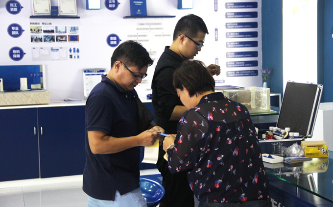 于總還通過家居防水模型等,介紹公司339定制防水系統(tǒng)優(yōu)勢及吸引力,以及特色防水維修補(bǔ)漏產(chǎn)品的使用。定制式的防水方案設(shè)計,讓客人佩服的五體投地!