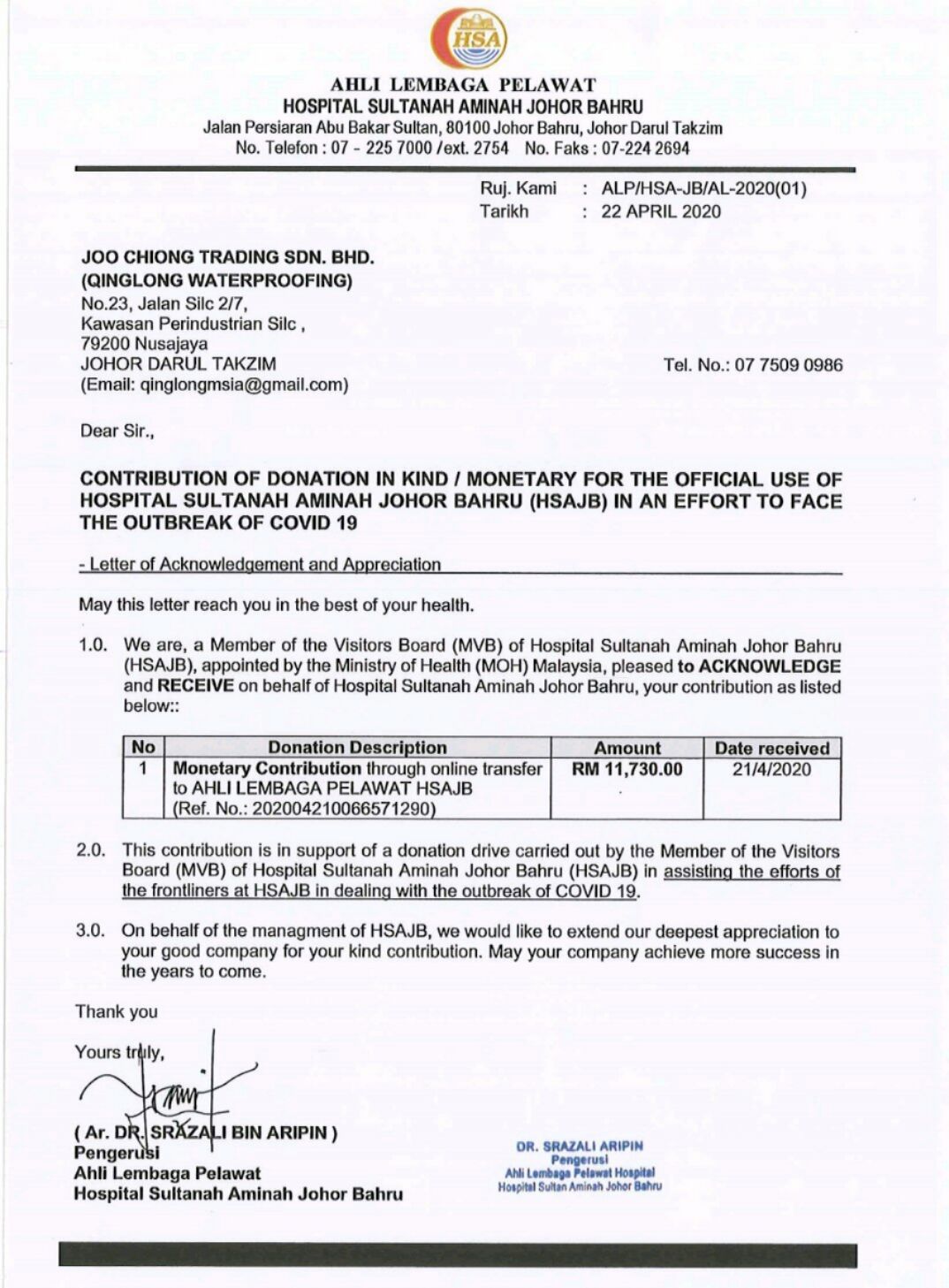 近日,馬來西亞Hospital Sultanah Aminah柔佛州新山醫(yī)院在收到物資后,致函表示了真誠的感謝,感謝青龍公司和廣大客戶的仁義之舉。