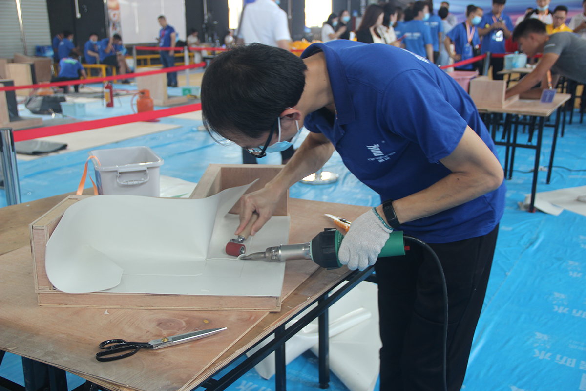 那么這邊是PVC高分子自粘膠膜,它也主要是考驗選手的搭接,搭接不牢的話,卷材就會容易竄水。高分子類,不管是PVC、HTPE、還是TPO,它們都是同樣的施工方法。我們現(xiàn)場比賽選用的是青龍的PVC防水卷材,它的搭接原理是熱風(fēng)焊接。熱風(fēng)焊接可分單焊線和雙焊線,選手比賽也是模擬屋面項目,先是裁線、剪切,然后是搭接,搭接縫也不能低于6公分。因為高分子材料的張力比較強,它沒有改性瀝青材料那樣服貼,它的難度相對于SBS要稍高的。