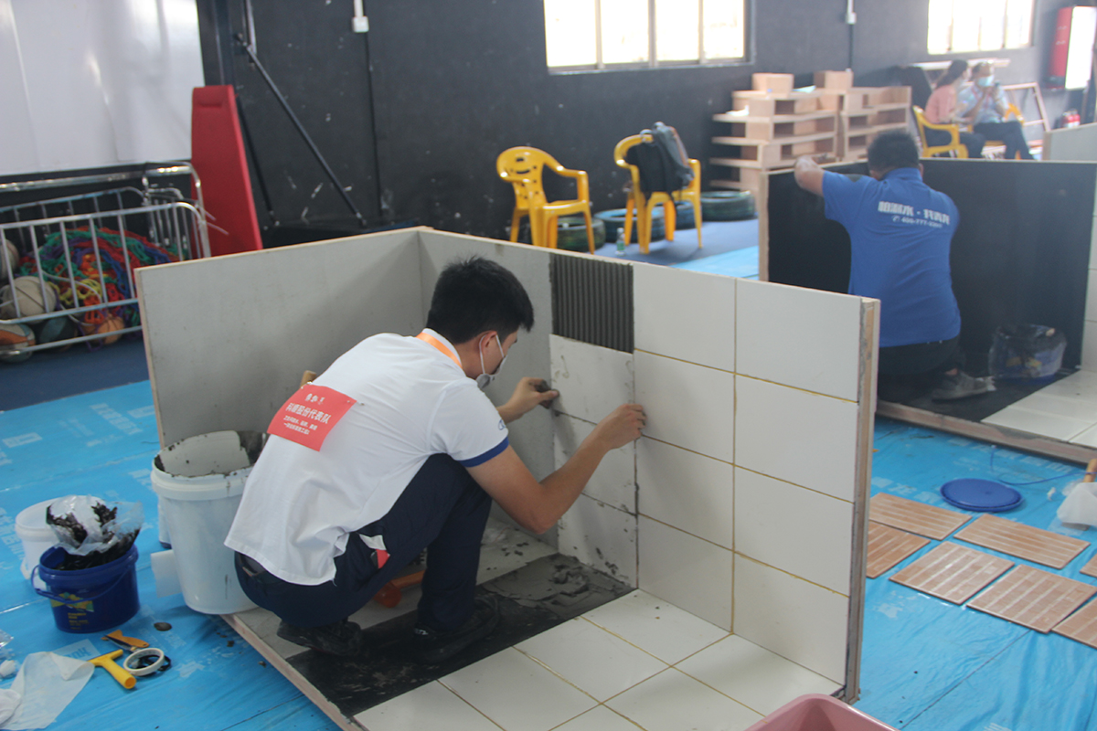 前面有一組是做衛(wèi)生間貼磚。傳統(tǒng)的認知,大家都以為防水技能工一定是農(nóng)民工,在社會地位得不到尊重。但是在這次的比賽場,有一個有趣的現(xiàn)象,選手越來越年輕化,你看還有很多是小鮮肉、小帥哥。所以說防水技能工不是沒有技術(shù)含量的普通的農(nóng)民工,而是有技術(shù)含量,可以受到社會認可的。包括今天的這次比賽,也是全國人社廳認可的,如果成績優(yōu)異的選手,都會獲頒發(fā)證書的。所以說,我們的選手越來越年輕化,不用擔(dān)心青黃不接的問題。