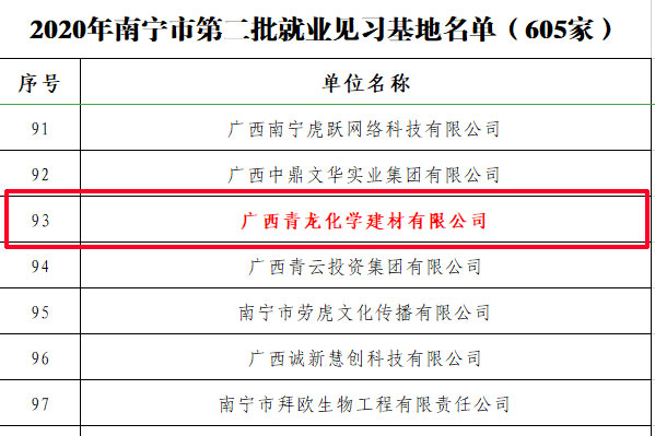 近日,從南寧市人力資源和社會保障局獲悉,為扎實推進高校畢業(yè)生就業(yè)見習工作,經(jīng)南寧市人力資源和社會保障局審核通過,我司廣西青龍化學建材有限公司被認為2020年~2022年南寧市就業(yè)見習基地。