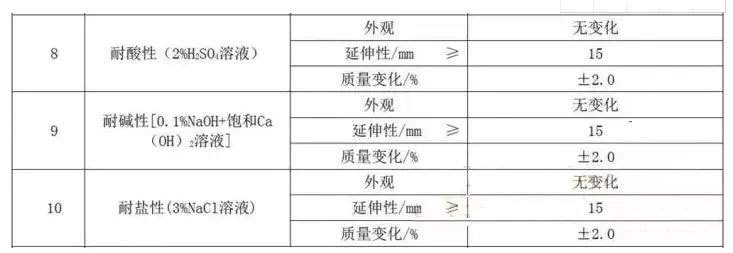 耐酸性、耐堿性、耐鹽性:耐酸、堿、鹽性反映了材料的抗腐蝕效果,通過外觀、延伸性和質(zhì)量變化來表示,標準要求如下: