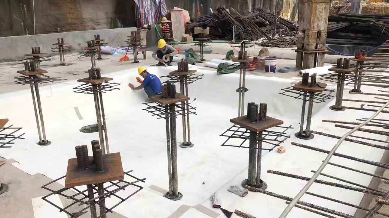 將地下室底板施工所用的1.2厚高分子預(yù)鋪防水卷材鋪貼于錨桿周?chē)砻?,并與大面卷材緊密搭接,緊貼于錨桿鋼筋底部。