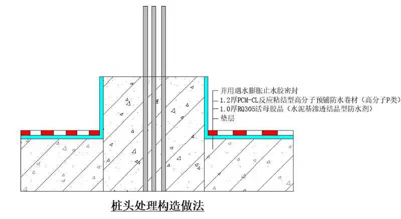 (1.0厚RQ305活母膠晶(水泥基滲透結(jié)型防水劑)+1.2厚PCM-CL反應(yīng)粘結(jié)型高分子預(yù)鋪防水卷材(高分子P類(lèi)附砂)+遇水膨脹止水膠)