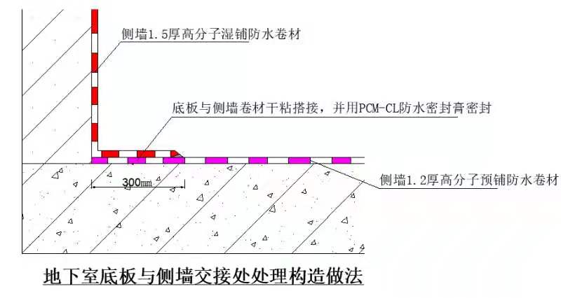按照濕鋪工藝,將側(cè)墻高分子濕鋪防水卷材鋪貼至交接處,并預(yù)留300mm搭接于底板卷材表面,卷材搭接處應(yīng)壓實(shí)平整,使其內(nèi)部無(wú)空鼓。搭接收頭處用PCM-CL防水密封膏密封。