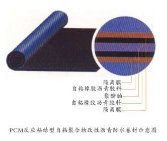 PCM反粘結(jié)型自粘聚合物改性瀝青防水卷材有兩種類型,一種是由合成橡膠和樹脂改性瀝青中加入特殊改性劑,聚酯胎為胎體,聚乙烯膜為表面材料或無膜(雙面自粘),采用硅油防粘隔離膜制成的;另一種是由PET聚酯膜(鍍鋁、鋁塑復(fù)合)、自粘橡膠瀝青料、硅油防粘隔離膜組成。