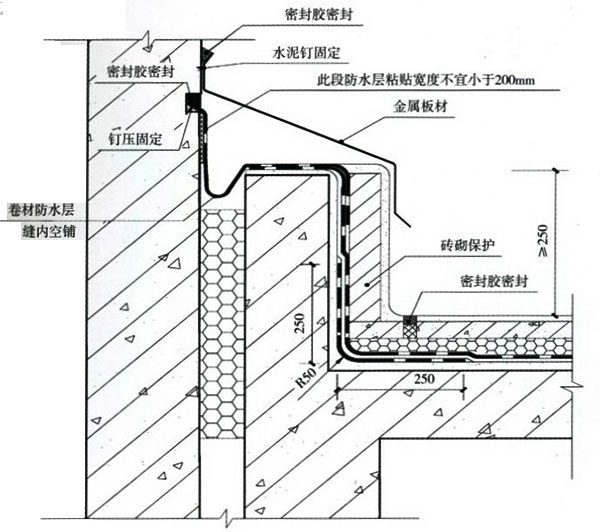 1.對(duì)變形縫的防水處理必須選用變形能力強(qiáng)及耐老化性能的合成高分子防水卷材,并應(yīng)具備有效的密封構(gòu)造措施。 2.屋面變形縫應(yīng)避免設(shè)計(jì)成平縫,變形縫墻應(yīng)采用≥C20混凝土澆筑,不得采用磚砌。變形縫墻體宜與屋面結(jié)構(gòu)板一起澆搗,不留施工縫。如不能一次澆搗,應(yīng)在墻體澆搗前施工縫位置嵌填5x8mm遇水膨脹密封膠。 3.在變形縫內(nèi)填背襯材料及彈性密封材料,對(duì)等高變形縫在墻頂鋪貼一條通長(zhǎng)“U" 形防水卷材,寬度與墻面同,先貼好一面,縫中嵌入聚乙烯泡沫塑料棒作襯墊,再粘貼另一面,上面再蓋一層高分子卷材,并與防水層相連接粘牢,形成整體防水層。然后在變形縫頂部加鋼筋混凝土蓋板或金屬蓋板,混凝土蓋板接縫用密封膠嵌填密實(shí)。 4.對(duì)高低跨變形縫,則按“U"形方式鋪設(shè)卷材,卷材上方的收頭應(yīng)塞入高跨墻體預(yù)留的凹槽內(nèi),用壓條或墊片釘壓固定,凹槽上部再用金屬披水板釘壓固定。卷材收頭及金屬板均用密封材料封嚴(yán)。 5.變形縫兩側(cè)防水層應(yīng)滿粘,縱向搭接寬度不小于200mm并密封嚴(yán)密。 |