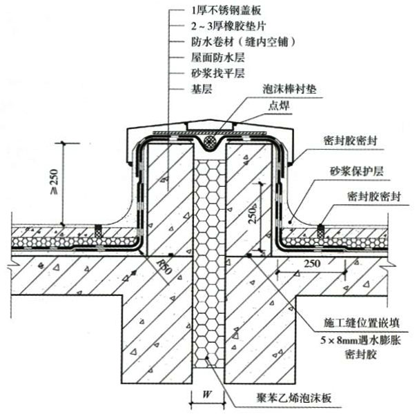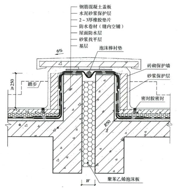 《屋面工程技術(shù)規(guī)范》 GB 50345-2012 4.11.18變形縫的防水構(gòu)造應(yīng)符合下列規(guī)定: 1.變形縫泛水處的防水層應(yīng)增設(shè)附加層,附加層在平面和立面的寬度不應(yīng)小于250mm;防水層應(yīng)鋪貼或刷至泛水墻的頂部。 2.變形縫內(nèi)應(yīng)預(yù)填保溫材料,上部應(yīng)采用防水卷材封蓋,并放置襯墊材料,再在其上干鋪一層卷材。 《屋面工程質(zhì)量驗(yàn)收規(guī)范》 GB 50207-2012 8.6.5 等高變形縫頂部宜加扣混凝土或金屬蓋板。混凝土蓋板的接縫應(yīng)用密封材料封嚴(yán);金屬蓋板應(yīng)鋪釘牢固,搭接縫應(yīng)順流水方向,并應(yīng)做好防銹處理。 8.6.6 高低跨變形縫在高跨墻面上的防水卷材封蓋和金屬蓋板,應(yīng)用金屬壓條釘壓固定,并應(yīng)用密封材料封嚴(yán) |