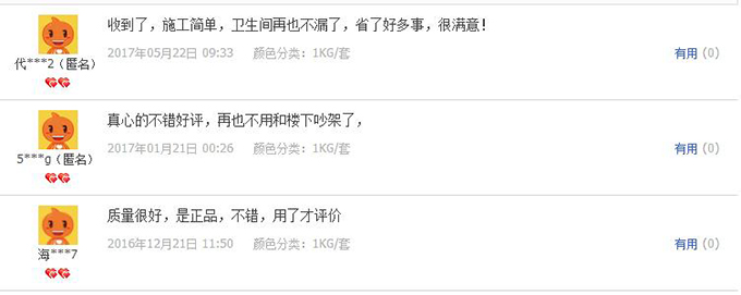 無論是線上客戶,還是線下業(yè)主,使用青龍3號的業(yè)主都一致地對青龍3號的防水性能給給予肯定和好評。其針對衛(wèi)生間滲漏的防水效果也讓其它產(chǎn)品自愧不如。