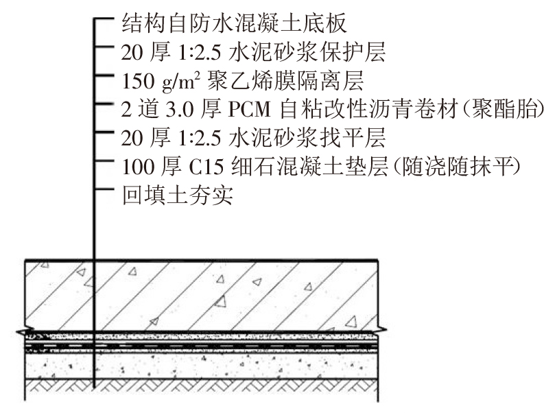 防水卷材選用本公司生產(chǎn)的3.0mm厚PCM自粘聚合物改性瀝青防水卷材(PY類)。該卷材是通過在樹脂和合成橡膠改性瀝青中加入少量活性成分,以聚酯胎作為胎體,以PE膜為表面材料,結(jié)合硅油隔離膜制備而成的防水卷材。該卷材具備較強的基層防竄水性能,卷材中的高分子材料可與基層粘接劑中的高分子和無機膠凝材料構(gòu)成界面互穿網(wǎng)絡(luò),能有效避免防水層出現(xiàn)整體失效的情況。材料可冷施工,無火災(zāi)隱患,不會污染環(huán)境,可直接在潮濕的基面上進行施工,基層無需做找平層,施工工藝便捷。另外,防水材料有較好的穩(wěn)定性、延伸性、耐腐蝕性和耐候性。
