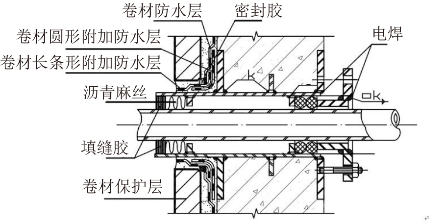 管道、線纜等存在更換需求,需用套管式防水設(shè)計,套管加焊止水環(huán)。套管與管道或線纜之間不得承受水壓,應(yīng)在節(jié)點的外部設(shè)置集水井。室內(nèi)套管的一端應(yīng)與外墻平齊,澆筑混凝土?xí)r端口預(yù)留的套管需密封,防止堵塞孔洞。室外套管突出外墻至少150mm,在外墻模板上定好預(yù)留穿墻管位置并開洞,外墻合模之前把套管放入模板洞中固定好,合模后再密封穿墻管與模板之間的間隙。管道與套管之間的間隙用柔性材料填充,保證端面光滑,同時管道的接口不得設(shè)置在套管內(nèi)。當(dāng)?shù)叵滤惠^高時,需在套管周圍設(shè)緊固裝置來確保縫隙的填充料密實和不發(fā)生位移(圖7)