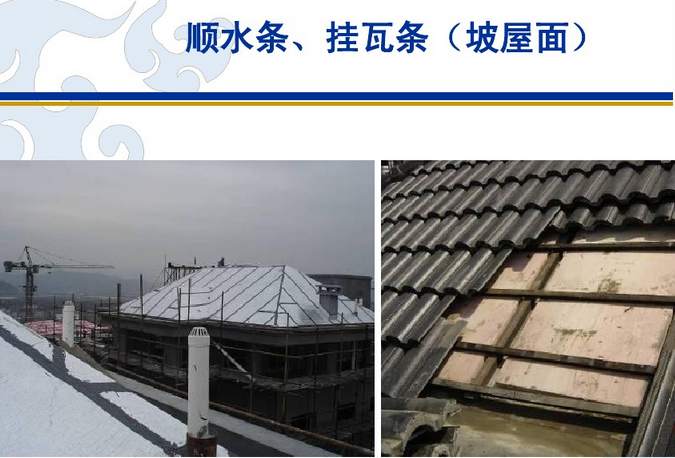 16、順水條:瓦下沿豎直方向設(shè)置的屋面構(gòu)件。處于掛瓦條下,防水層上。主要作用是架空掛瓦條。掛瓦條作用是將屋頂表面的瓦片固定在相應(yīng)位置。搭配使用合適的順水條可以使得屋頂?shù)呐潘Ч屯L效果顯著增強,有利于保持夏季的涼爽和冬季的溫暖。