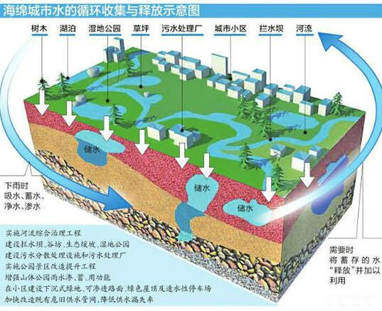 建海綿城市就要有“海綿體”。城市“海綿體”既包括河、湖、池塘等水系,也包括綠地、花園、可滲透路面這樣的城市配套設(shè)施。雨水通過(guò)這些“海綿體”下滲、滯蓄、凈化、回用,之后剩余部分徑流通過(guò)管網(wǎng)、泵站外排,從而可有效提高城市排水系統(tǒng)的標(biāo)準(zhǔn),緩減城市內(nèi)澇的壓力。