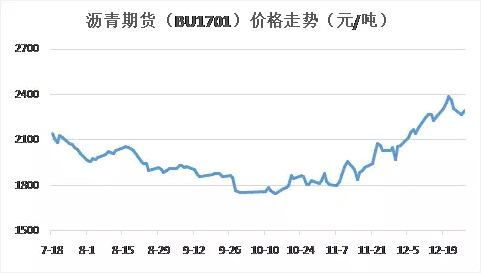 7月份之后,瀝青期貨價格一路下跌,至10月走穩(wěn)。11月上旬,受國際原油價格波動影響,瀝青期貨價格開始穩(wěn)步上升,從1830元/噸上漲至12月中旬的2386元/噸,漲幅達到30%。