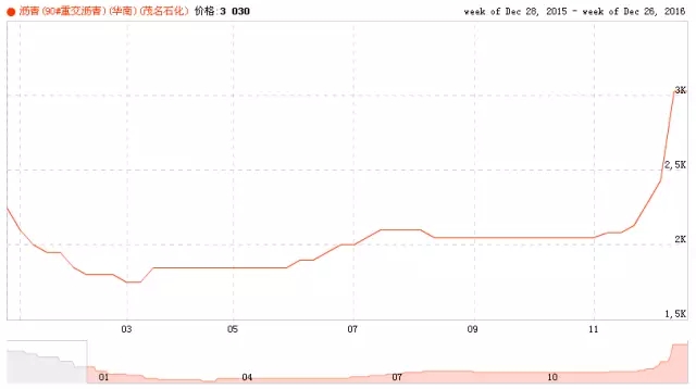 從茂名石化的90#重交瀝青價格數據看,11月初的價格還保持在2050元/噸,到12月19日,價格已經上升至3030元/噸,漲幅達到47.80%。