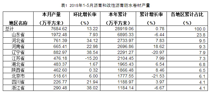為進一步了解我國瀝青和改性瀝青防水卷材產(chǎn)量,國家統(tǒng)計局對產(chǎn)量較大的176家防水企業(yè)進行統(tǒng)計,1-5月,瀝青和改性瀝青防水卷材產(chǎn)量為28919.06萬平方米,同比增長0.78%;其中山東地區(qū)產(chǎn)量較大,為6895.33萬平方米,同比下降6.44%,占全國累計產(chǎn)量的23.8%。