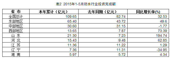 國家統(tǒng)計局對主營業(yè)務(wù)收入高于2000萬元企業(yè)進行統(tǒng)計,1-5月,防水行業(yè)投資完成額109.65億元,同比增長32.53%。其中,山東地區(qū)的投資完成額為21.30億元,同比增長194.74%。