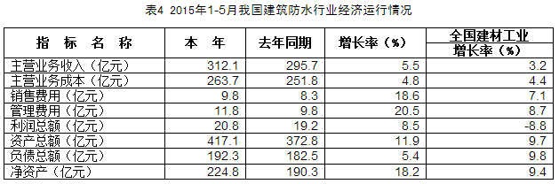 對全國491家主營業(yè)務(wù)收入在2000萬元以上的企業(yè)進行統(tǒng)計,資料顯示,1-5月,防水行業(yè)企業(yè)累計主營業(yè)務(wù)收入312.1億元,同比增長5.5%,增幅高于全國建材工業(yè)2.3個百分點。主營業(yè)務(wù)成本增幅略高于全國建材工業(yè)。利潤總額為20.8億元,同比增長8.5%,全國建材工業(yè)利潤總額負增長,同比下降8.8%。